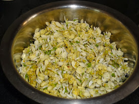 Grind rice, jeera, chilli powder and salt together to a fine paste. Add the drumstick flowers and just grind a bit. The flowers should be rough ground.